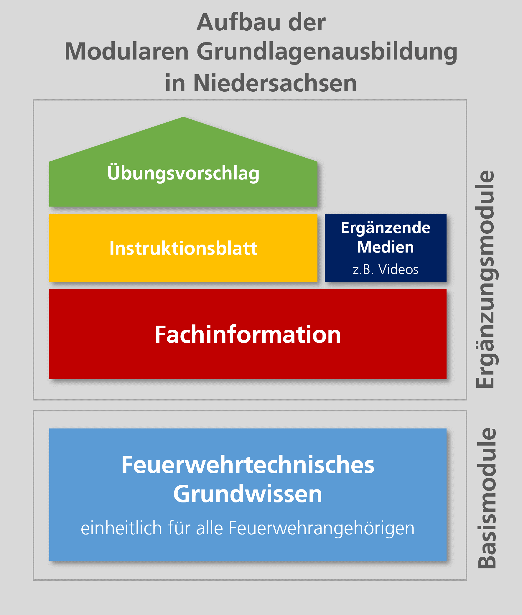 Die Basismodule der modularen Grundlagenausbildung sind der Grundbaustein der Ausbildung der Freiwilligen Feuerwehren Niedersachsens. Sie orientieren sich an der Ausstattung und den Möglichkeiten einer Ortsfeuerwehr mit Grundausstattung und behandeln somit die grundlegenden Themenbereiche für jeden Feuerwehrangehörigen.