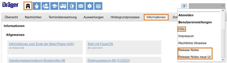 FeuerON ist für die Nutzenden online erreichbar. Direkt über die Übersichtsseite können über das gleichnamige Menü Informationen zu einzelnen Themen abgerufen werden. Darüber hinaus steht die Hilfe-Funktion zur Verfügung (unterhalb der Abmeldung). Die dort ebenfalls befindlichen Release-Notes informieren über aktuelle Neuerungen und Verbesserungen.