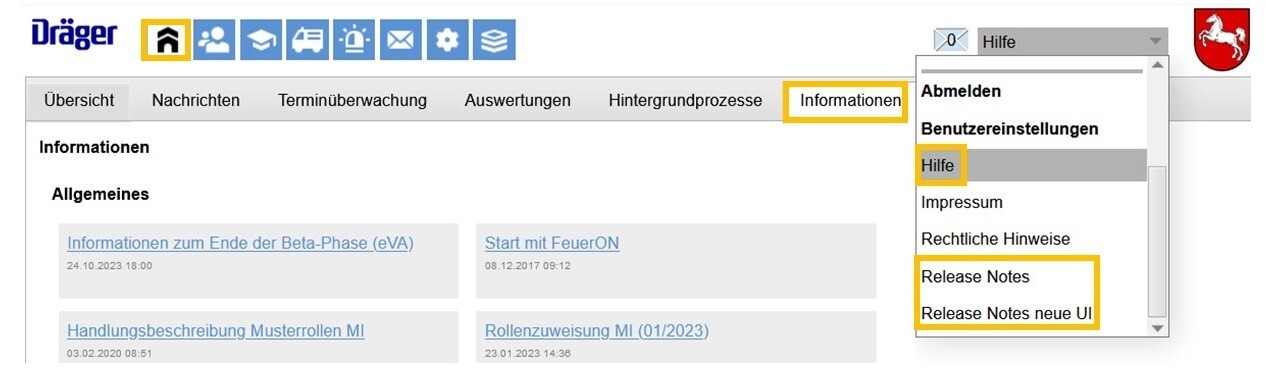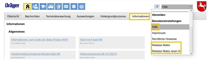 FeuerON ist für die Nutzenden online erreichbar. Direkt über die Übersichtsseite können über das gleichnamige Menü Informationen zu einzelnen Themen abgerufen werden. Darüber hinaus steht die Hilfe-Funktion zur Verfügung (unterhalb der Abmeldung). Die dort ebenfalls befindlichen Release-Notes informieren über aktuelle Neuerungen und Verbesserungen.